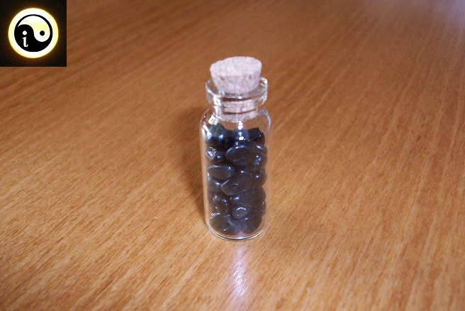 Buteleczka szklana napełniona drobnymi kamyczkami onyksu, czyli agatu czarnego – uważa się, że jest to kamień ochronny, usuwający wszelkie przeszkody, oraz osoby nieprzychylne, lub fałszywe robiąc miejsce na nowe lepsze znajomości.