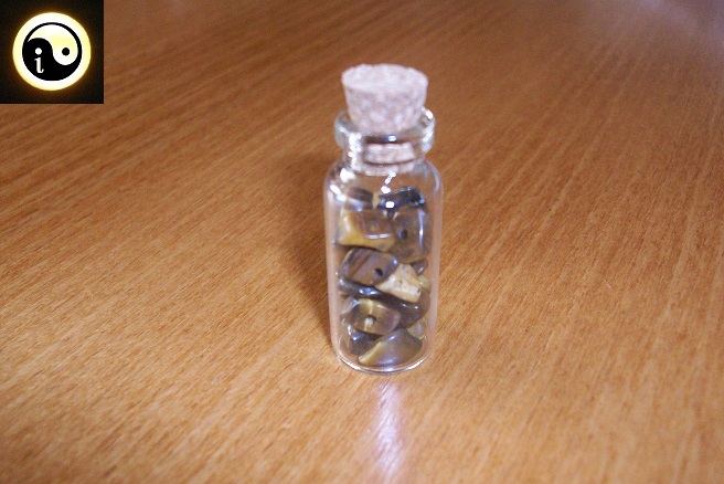 Buteleczka szklana napełniona drobnymi kamyczkami tygrysiego oka – uważa się, że jest to kamień przyciągający pieniądze, bogactwo i wszelką obfitość