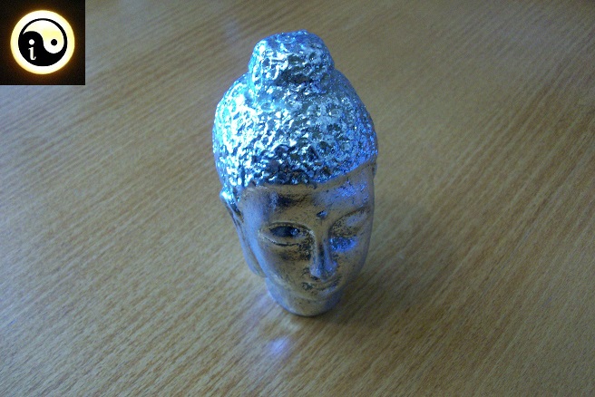 Ceramiczna głowa Buddy koloru srebrnego – służy nie tylko do ozdoby, ale też do medytacji polegającej na wpatrywaniu się w punkt na czole Buddy