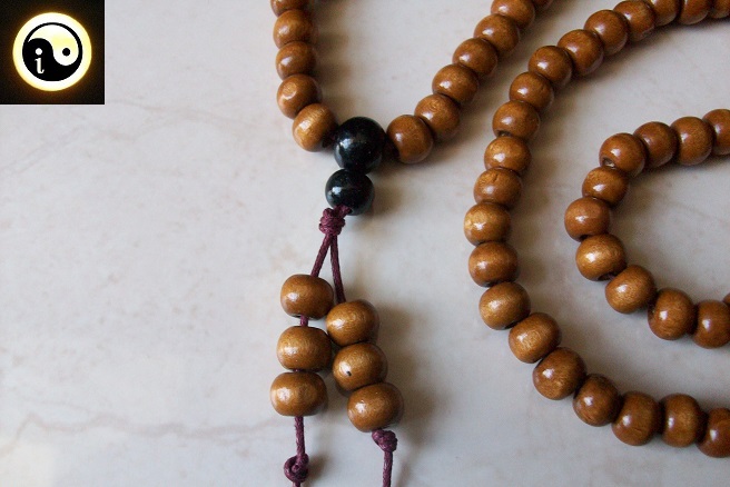 Mala tybetańska, czyli buddyjski różaniec do odprawiania mantr. Koraliki mali widocznej na zdjęciu są wykonane z drewna lakierowanego i mają ok. 8mm. Długość całkowita złożonej, wyciągniętej mali to ok 46 cm. Dodatkowy szerszy koralik jest koloru czarnego.
