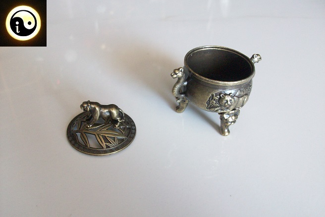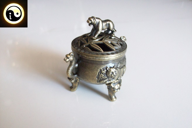 Metalowa kadzielnica z ażurową pokrywką z tygrysem przez którą wydobywa się dym – do spalania kadzidełek stożkowych lub ziół i żywic na małym węgielku.