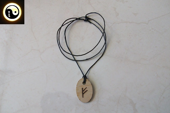 Wisiorek z wypaloną runą Fehu – jest to runa bogactwa i wszelkiej obfitości.